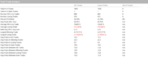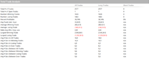 Analizzando invece la Total Trade Analysis (Figura 3), si osserva che la strategia effettua esclusivamente operazioni long, come previsto, con un totale di 2.577 trade. La percentuale di operazioni profittevoli si attesta intorno al 39,7%, un valore tipico per strategie trend following, che tendono a ottenere un numero limitato di trade vincenti ma con guadagni medi superiori rispetto alle perdite.