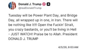 Martedì in Iran sarà la Giornata delle Centrali Elettriche e la Giornata dei Ponti (…) Aprite il fottuto Stretto, pazzi bastardi, o vivrete all’inferno! (…) Sia lode ad Allah.