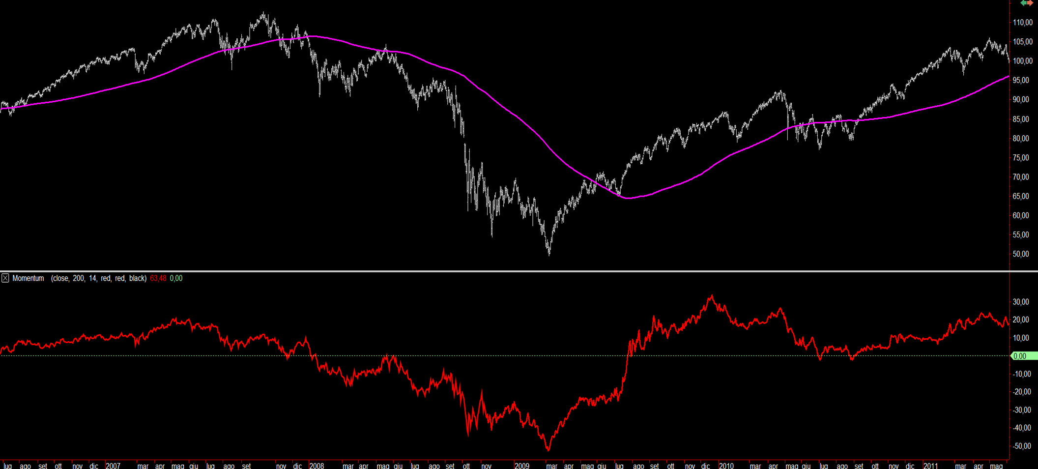 In Figura 2 riportiamo un confronto visivo tra Momentum e media mobile. Si può notare come entrambi abbiano l’obiettivo di distinguere le fasi di mercato positive da quelle negative.