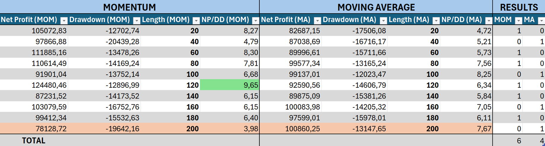 Tuttavia, osservando gli altri orizzonti temporali, vediamo che la situazione cambia: nella maggior parte dei casi è proprio il Momentum a prevalere, con rapporti NP/DD migliori rispetto alla media mobile. In particolare, il risultato migliore si ottiene con un Momentum calcolato a 120 periodi, che corrisponde grossomodo a un quadrimestre di contrattazioni.