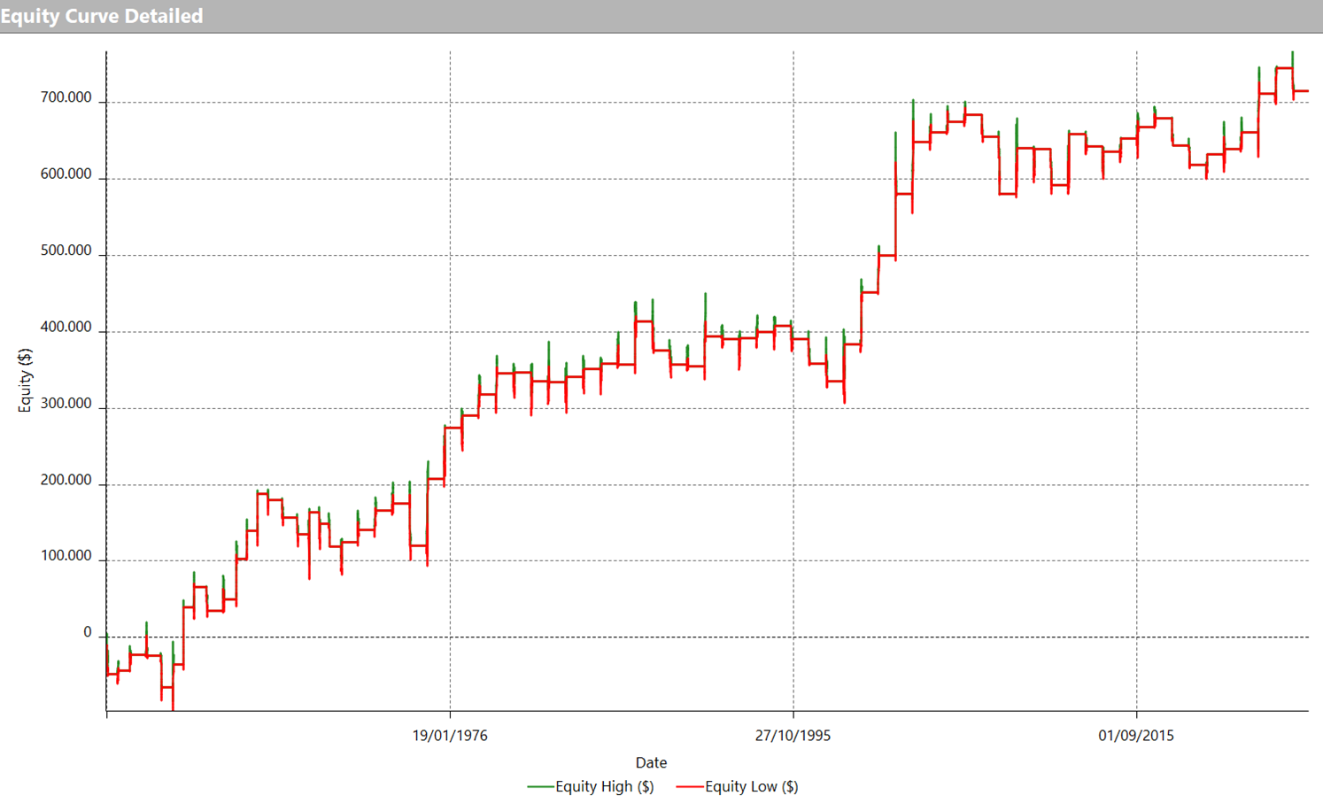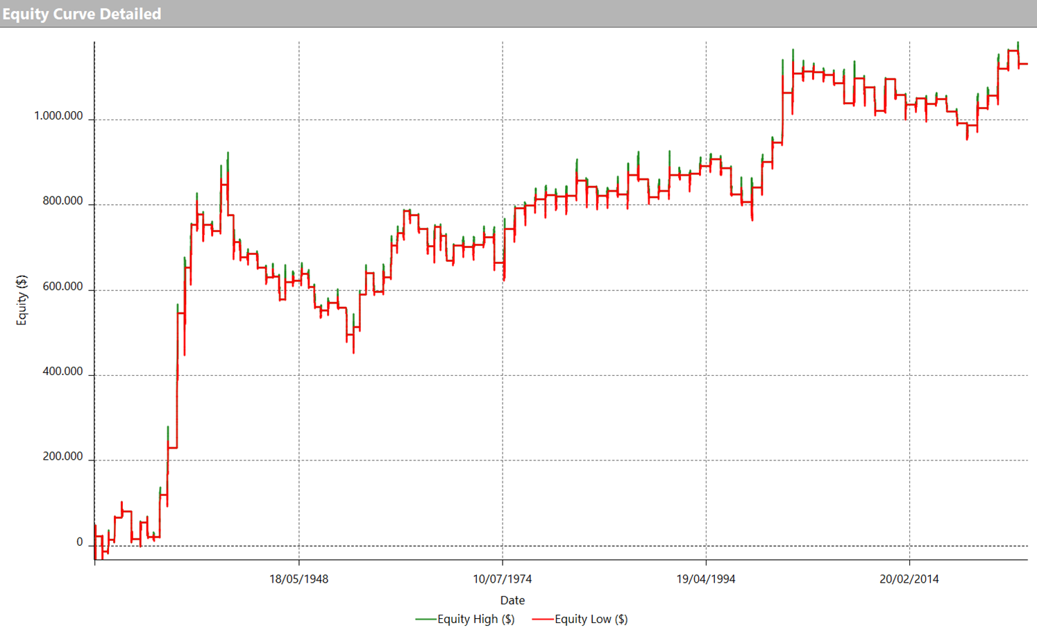 Osservando l’equity line della strategia (Figura 2), si nota come i risultati più esplosivi siano concentrati nella parte iniziale della serie storica. Una fetta importante dei profitti deriva infatti dai primi decenni del campione, periodo in cui troviamo anche eventi eccezionali come la crisi del 1929.