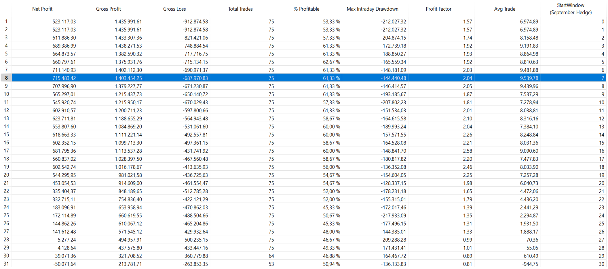 In particolare, il risultato migliore si ottiene entrando short il giorno successivo al 7 settembre (StartWindow = 7), in termini di net profit, ma anche analizzando l’average trade e il drawdown. Numeri che migliorano sensibilmente rispetto all’ingresso del 1° settembre, già di per sé positivo ma meno performante.