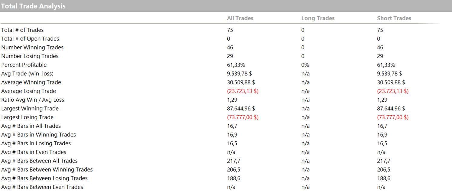 Guardando i dati della Total Trade Analysis, in Figura 6, emergono ulteriori elementi di interesse: la strategia ha generato 75 operazioni, con una percentuale di successo del 61,3%. L’average trade si attesta a circa 9.500 dollari, che rapportato al controvalore iniziale di 1 milione equivale a un rendimento medio di circa +0,95% per trade, ampiamente in grado di ripagare i costi di slippage e commissioni.