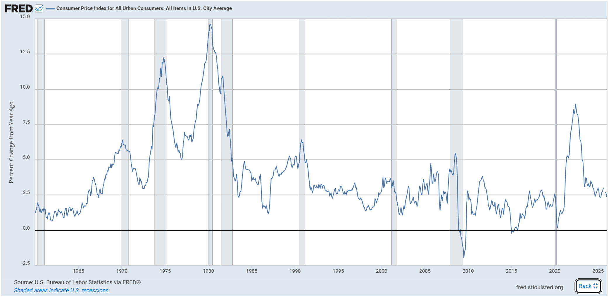 Per misurare questo fenomeno si utilizza spesso il Consumer Price Index (CPI), cioè l’indice dei prezzi al consumo. La Figura 1 mostra proprio l’andamento dell’inflazione statunitense su base annua.