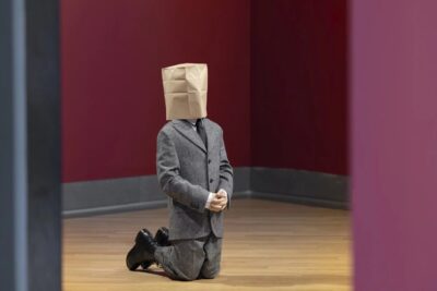 Il terzo lavoro, esposto nelle sale del museo, nasce dalla rielaborazione dell’iconica scultura Him (2001), in cui Maurizio Cattelan rappresentava Adolf Hitler inginocchiato in preghiera, con il volto rivolto verso l’alto in un gesto ambiguo, tra supplica e finzione. La figura, modellata con fattezze infantili, evoca a prima vista l’immagine innocente di un bambino, generando un cortocircuito visivo ed emotivo nel momento in cui lo spettatore riconosce l’identità del soggetto. La scelta di coprire il volto -scaturita da una richiesta di censura in occasione di una mostra in Cina- è ambigua: è al tempo stesso una forma di punizione e di protezione. Protezione dello spettatore dal trauma, ma anche del soggetto dal giudizio. Così, No interrompe il circuito del riconoscimento visivo, negando al volto la possibilità di diventare icona. L’occultamento diviene il fulcro dell’opera: il sacchetto non è solo un atto di censura, ma un dispositivo che sposta il focus su ciò che non si mostra, che diventa più inquietante di ciò che si vede.