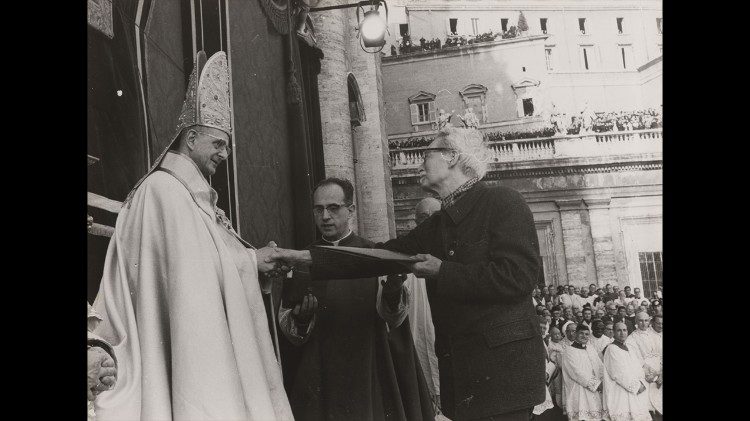 Papa Paolo VI consegna a Jacques Maritain il messaggio per gli uomini di scienza e gli intellettuali alla fine del Concilio Vaticano II, l’8 dicembre del 1965, sul sagrato della Basilica di San Pietro.