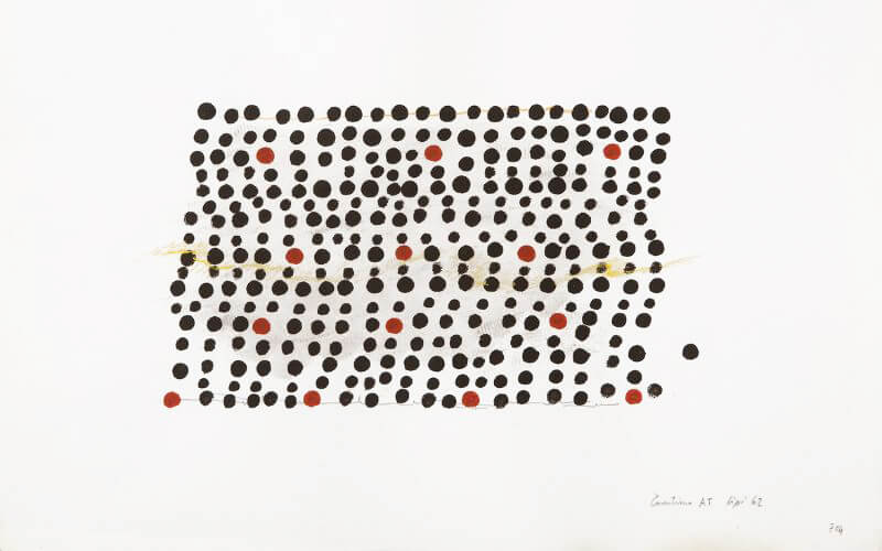 Dei 29 cicli in mostra, si citano alcuni esempi: le prime sperimentazioni, “Figurativi” e “Astratti-informali”, cui seguono, legate alla “nascita del punto” (1962), le griglie geometriche e luminose dei “Continui”, i paesaggi interiori e musicali delle “Variabili”, dei “Puntoritmi” e dei “Ritmi”; a caratterizzare gli anni ’80 sono invece “Campi”, “Cieli” e “Luci” mentre, a partire dagli anni ’90, si assiste ai lavori scaturiti dalle esperienze americane, come “New York”, “Costellazioni”, “Icone” ed “Eventi”, per arrivare nell’ultimo periodo a “Fleurs” e “Partiture”.