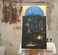 Daniele Cristallini per l’importanza che va ad assumere questo piccola chiesa presenta in questa mostra tutte opere inedite, realizzate appositamente per questo particolare contenitore espositivo, un luogo sacro e silente che sorge accanto al piccolo cimitero del paese. L’autore, partendo dal luogo come cornice di una mostra ideale, sceglie di realizzare tutti i dipinti seguendo il tradizionale impianto della Pala d’Altare, opera che in tutte le chiese troviamo collocata sopra l’altare sulla parete di fondo del presbitero. Cristallini utilizza nelle opere in mostra delle gradazioni di colore che richiamano i toni che si trovano sulle pareti affrescate secondo lo stile antico, e crea così un collegamento tra il passato e il presente contemporaneo, sottolineando come ripercorrendo il fil rouge del colore del tempo e della storia si possa riesaminare trasversalmente la Storia dell’Arte, evidenziandone i punti di contatto tra il luogo e gli artisti che lo hanno animato.