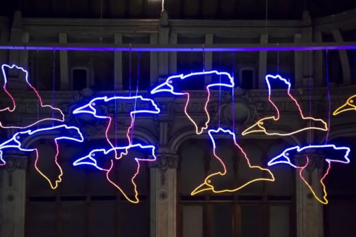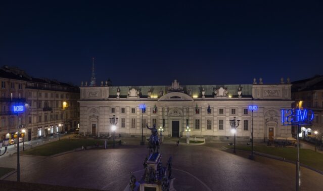 Si riaccende sul Ponte Vittorio Emanuele I, completamente restaurata grazie alla Consulta per la Valorizzazione dei Beni Artistici e Culturali di Torino e di Unione Industriali Torino insieme a NeonLauro, Doppio passaggio (Torino), l’opera ideata nel 2001 da Joseph Kosuth. Alcune Luci cambiano sede rispetto alla precedente edizione: VR MAN di Andreas Angelidakis, inaugurata lo scorso anno in Piazza Vittorio, si potrà quest’anno ammirare in Piazza Bodoni. La storica opera del 1998 Volo su… di Francesco Casorati sarà in Via Principe Amedeo mentre Migrazione (climate change) di Piero Gilardi realizzata nel 2015 trova sede in Via Sant’Agostino. Dopo tre anni AZZURROGIALLO di Giorgio Griffa torna nei Giardini Cavour, luogo per cui l’artista l’aveva pensata nel 2022, così come Luì e l’arte di andare nel bosco di Luigi Mainolfi torna a risplendere in Via Lagrange, Noi di Luigi Stoisa in Via Garibaldi e Palomar di Giulio Paolini è nuovamente allestita in Via Po.