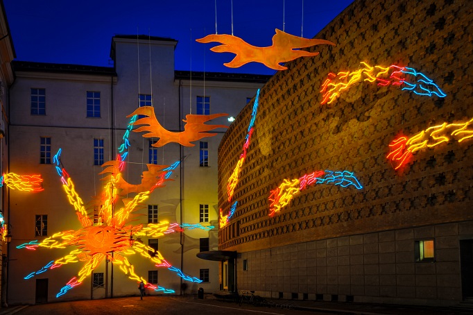 Infine, grazie al contributo del Lithuanian Culture Institute, nell’ambito dell’anno della cultura lituana in Italia, la collezione di opere luminose accoglierà sulla facciata del Museo Regionale di Scienze Naturali l’importante opera al neon Untitled dell’artista lituano Gintaras Didžiapetris, già protagonista di manifestazioni internazionali come la Biennale di Venezia.