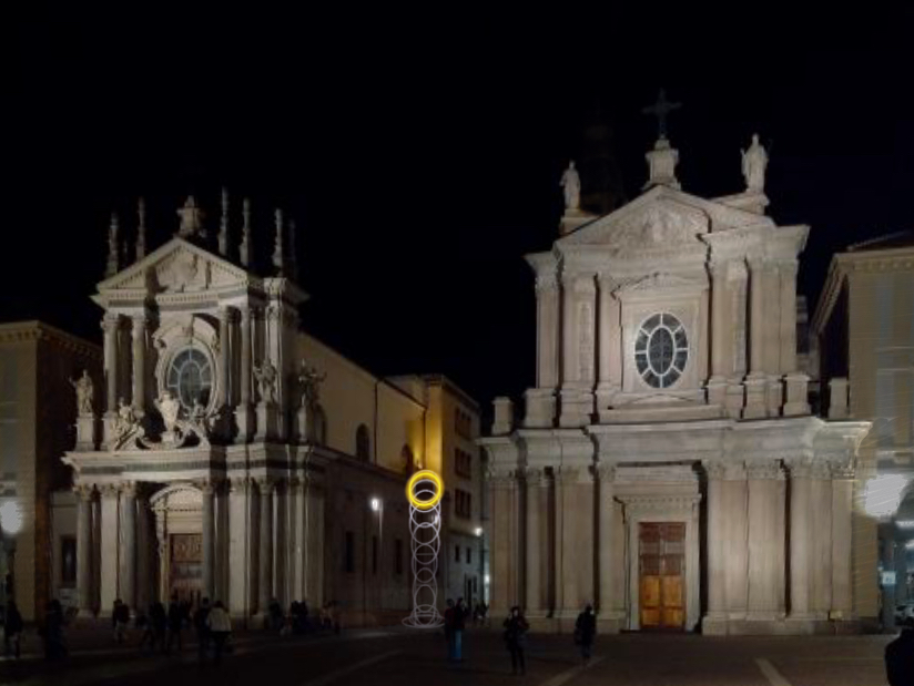 inserisce in Piazza San Carlo come un dispositivo poetico e concettuale, capace di attivare nuove letture dello spazio pubblico e del tempo condiviso”. L’opera rappresenta l’azione del rimbalzo e la deformazione di una pallina nell’istante dell’impatto: il gesto tecnico diventa forma essenziale, un congelamento luminoso del tempo. Realizzata con il supporto di Nitto ATP Finals, evento del grande tennis mondiale ospitato a Torino dal 2021, l’opera prende spunto dal palleggio che precede il servizio: metafora di consapevolezza, fragilità e imprevedibilità, il “momento sospeso in cui ci si raccoglie, si discerne, si decide”. La Luce si trasforma, evolvendo da un’ellisse a un cerchio perfetto – una forma universale e ricorrente nella pratica dell’artista. Il cerchio è anche buco, soglia, principio di permeabilità e passaggio. In Piazza San Carlo, l’opera dialoga con le due chiese gemelle, le cui facciate presentano grandi rosoni ellittici, forme che ritornano nel rimbalzo luminoso in evoluzione dinamica. La combinazione tra la semplicità del cerchio e la complessità dell’ellisse richiama il passaggio dal Rinascimento al Barocco: da un centro unico a due fuochi, da geometrie pure a forme dinamiche. Riccardo Previdi esplora la relazione tra arte, architettura e design, con attenzione alla dimensione progettuale come spazio di connessione tra linguaggi. Ha esposto in sedi internazionali tra cui Kunst Raum Riehen (2023), Museion (2023), Villa Croce (2017), Marta Herford (2011), Manifesta 7 (2008).
