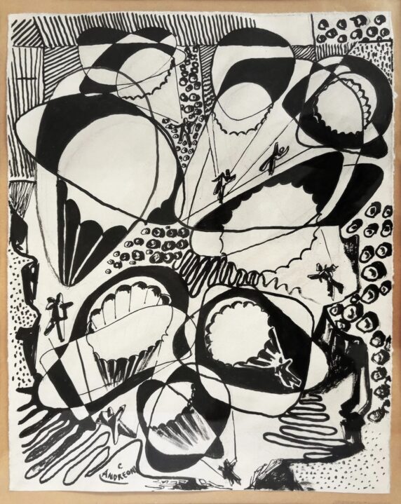 La modernità, quella modernità che caratterizzava il futurismo e tanto cara all’Avanguardia di Marinetti, si mostrava in tante opere di Andreoni, unitamente a colori, forme, costruzione dei piani che si ritrovano sia nelle ambientazioni urbane che nelle visioni più paesaggistiche; lo si nota anche dai titoli delle opere presenti in mostra, perché Andreoni non dipinge città ma “Metropoli” -preludendo al futuro-, quasi sempre sorvolate da aeroplani che tagliano cieli notturni, tra imponenti viadotti e grattacieli squadrati, quasi monolitici, dalle cui finestre brilla la potenza di centinaia di lampade elettriche. Il verde della natura torna nei dipinti dedicati al “Galoppo” (1937) e alle “Auto in corsa” (1935), due motivi pittorici da sempre apprezzati dai futuristi, a partire dalle ricerche sulla velocità e il dinamismo di Balla e Boccioni. Le chine su carta, invece, risentono dell’affermarsi di un nuovo clima stilistico all’interno del Movimento. Il “mondo visto dal cielo” dell’aeropittura, innesta arditi scorci prospettici tra gli intrecci d’ali dei velivoli in una dinamica frammentazione geometrica, incorporando aeroplani, paracadutisti e perfino motoscafi. Andreoni ha saputo interpretare con la stessa originalità anche trame e soggetti meno convenzionali al repertorio futurista; tra le opere esposte è il caso dei dipinti “La tempesta” (1927-1930) e “Le danzatrici” (1927-1928), in cui l’energia e lo slancio dell’Avanguardia riverberano ora nel furore di un fulmine, ora nel vortice di un ballo.