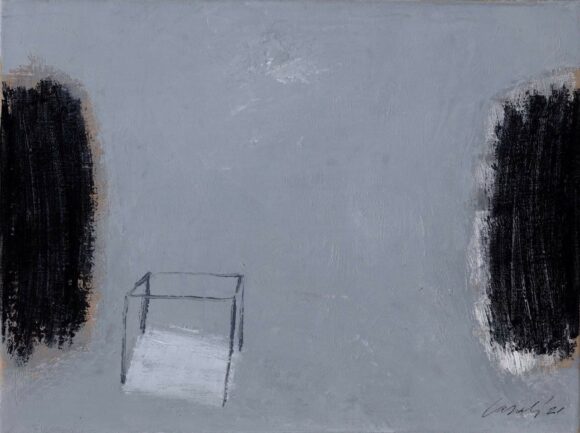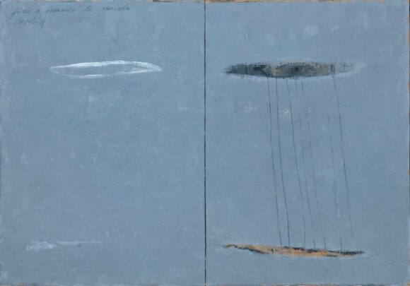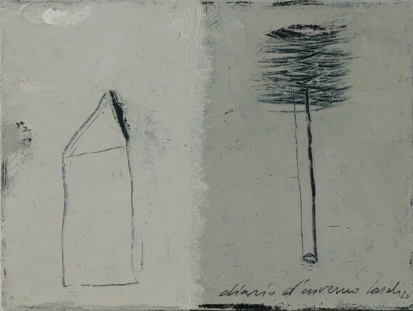 Alfredo Casali se ne fa interprete in pittura. Sin dalle sue prime opere giovanili, influenzate dall’astrattismo lirico di Gastone Novelli o di Cy Twombly, dalla poesia visiva e da una figurazione sospesa, carica di attese ed erede della lezione silenziosa di Morandi, l’artista ha tratteggiato nello spazio confini minimi, luoghi vitali circoscritti alla dimensione di un quotidiano intimo, sublimati come archetipi domestici: la casa, l’albero, la sedia, la toppa di paesaggio che affaccia sul vuoto del mare o del cielo. Rigore formale, sintesi geometrica e una cura del segno come elemento espressivo e letterario, derivato dalla sua solida formazione filosofica, nutrono una pratica pittorica e un immaginario coerente, profondamente meditato, lento nel gesto, nelle pause, nella scansione dei piani che costruiscono altri vuoti. La sua poetica rarefatta ed essenziale oggi approda alle soglie dell’isola, che è un disegno dai bordi slabbrati sulle mappe della coscienza, una epifania di roccia e sabbia sul piano cartesiano della geografia umana e cosmica.