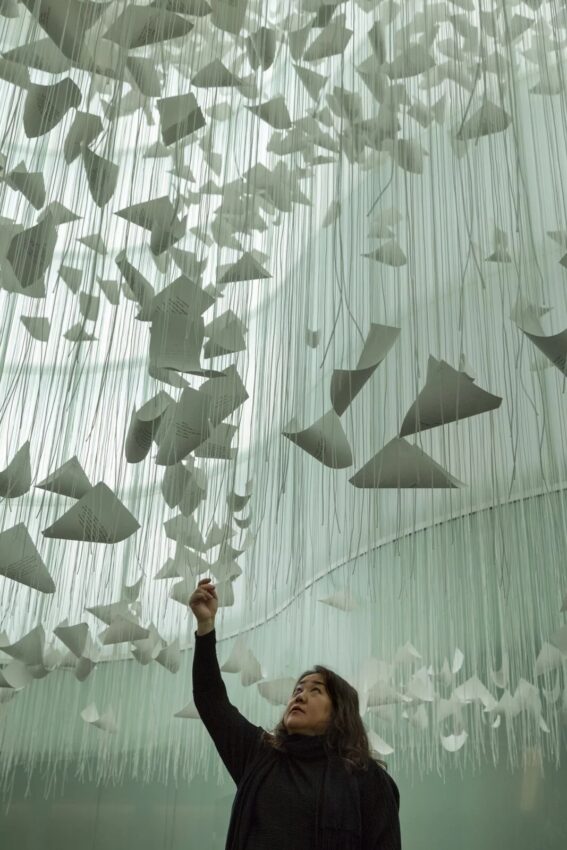 Nell’installazione site-specific “The Moment the Snow Melts” Chiharu Shiota, utilizzando la precarietà della neve come metafora, riflette sulle relazioni umane e su come queste inevitabilmente iniziano e finiscono. L’artista crea un paesaggio evanescente composto da fili che scendono a piombo dal soffitto, in mezzo ai quali fluttuano biglietti e fogli di carta che contengono i nomi di persone che hanno fatto parte delle nostre vite ma che, per i motivi più diversi, non ci è più possibile incontrare. Si tratta di una nevicata metaforica, bloccata in un momento preciso del tempo, tanto da non arrivare a terra, e rappresenta per il pubblico uno spazio di meditazione.