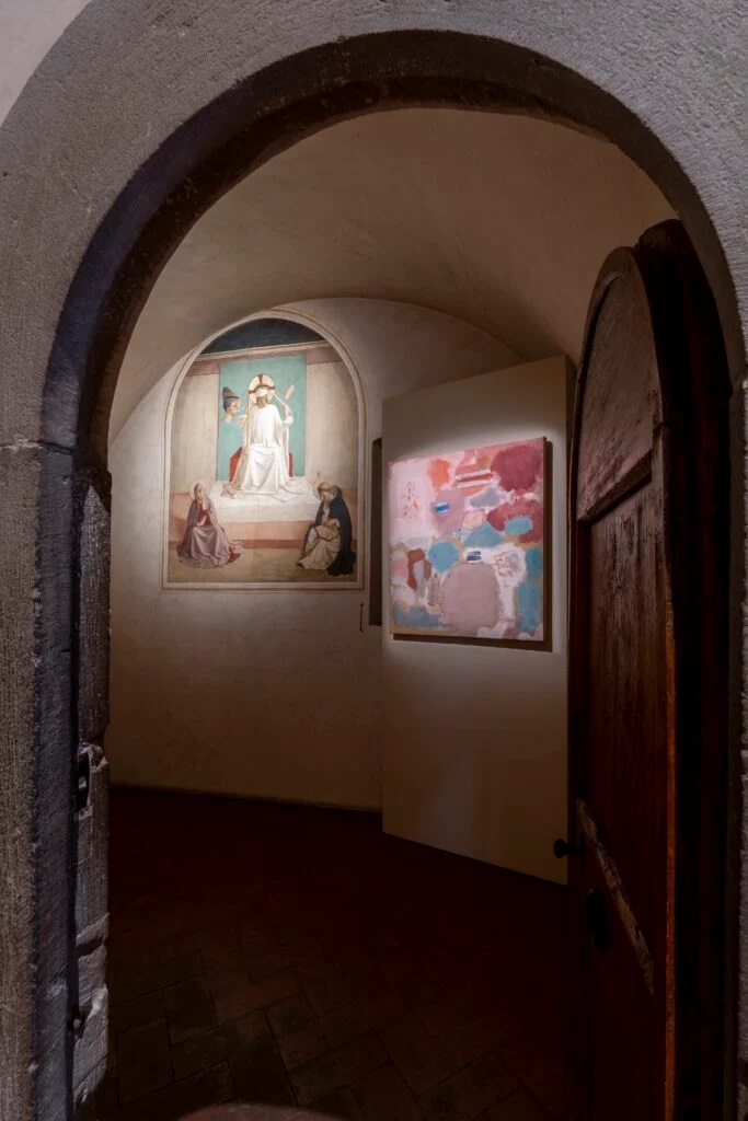 Il primo incontro dell’artista con Firenze risale al 1950, durante un viaggio in Italia insieme alla moglie Mell. L’artista rimane particolarmente affascinato dalla pittura di Beato Angelico al Museo di San Marco e dall’architettura del Vestibolo della Biblioteca Medicea Laurenziana. Quest’ambiente unico – che l’artista visiterà nuovamente nel 1966 – sarà fonte di ispirazione per la serie dei Seagram Murals, realizzata alla fine degli anni Cinquanta. Nelle opere dalle tonalità più delicate è invece palpabile l’influenza dell’arte italiana del Quattrocento e, in particolare, di Beato Angelico. Entrambi gli artisti condividono il desiderio di evocare un senso di trascendenza, una dimensione al tempo stesso distante e profondamente familiare. Se Beato Angelico riesce a coniugare senso del divino e realtà terrena attraverso l’emozione della pittura, Rothko costruisce campiture cromatiche capaci di indurre diverse tensioni emotive, mettendo in discussione i concetti consolidati di astrazione e di teoria del colore.