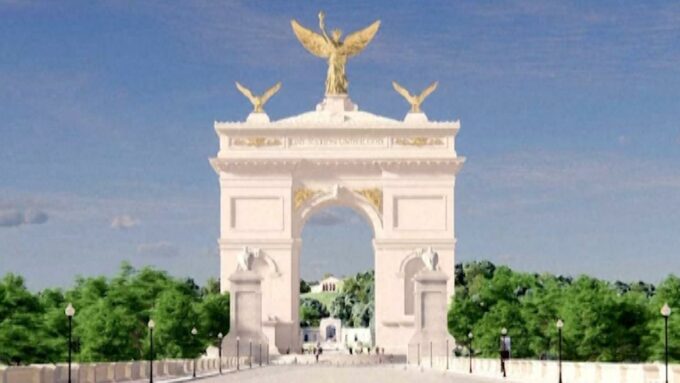 Trump si sente un imperatore romano. Già, perché i romani a suo tempo ebbero modo di conquistare il mondo d’allora. Gesti e segni si ripetono. Nell’ immagine il progetto per un arco di 76 metri a Washington, voluto dal presidente degli Stati Uniti Donald Trump, che, se approvato, trasformerebbe lo skyline della capitale. I rendering sono stati presentati dai funzionari dell’amministrazione Trump in vista della riunione della prossima settimana per portare avanti il progetto. Prevedono un arco color avorio, ispirato a quello di Tito imperatore dell’antichità classica e simile all’Arco di Trionfo di Parigi. L’arco presenta vari elementi decorativi dorati, tra cui spicca un’imponente statua di 18 metri in cima che ricorda la Statua della Libertà con le ali d’angelo. Ai lati, due statue di aquile alte 7 metri. Altri elementi del progetto includono quattro statue di leoni dorati. Sarebbe destinato a commemorare il