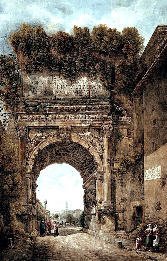 L’Arco di Tito sta a Roma sulla cima settentrionale del Palatino, nella parte ovest del Foro Romano, con incisa l’iscrizione: “Senatus populusque romanus – divo Tito divi Vespasiani f(ilio) – Vespasiano Augusto“, ossia “Il Senato e il popolo romano al divino Tito, figlio del divino Vespasiano, Vespasiano Augusto”. Il monumento, dedicato da Domiziano al padre Vespasiano ed al fratello Tito, celebrava il fratello dopo la morte avvenuta nell’81 d.c., per ricordarne le vittoria in Giudea nel 71 d.c. e la distruzione di Gerusalemme. Gli ebrei sempre ribelli alla dominazione romana, nonostante gli fosse stata riedificata magnificamente la loro capitale, non sopportavano soprattutto la presenza di altri templi con altri Dei che colpivano la loro religione monoteista. Dell’arco stranamente non c’è menzione negli scrittori antichi, e neppure nei regionari costantiniani. Soltanto sopra un rilievo del sepolcro degli Aterii sulla Via Labicana, ora proprietà del Vaticano e custodito nell’invisitabile, Museo Lateranense, che rappresenta la Sacra Via dal Palatino fino al Colosseo, l’arco è effigiato con il nome di Arcus in Sacra Via summa. ” A Tito figliuolo di Vespasiano Imperadore degnissimo chiamato perciò meritamente Delicia generis humani fù eretto quest’Arco dal Senato per memoria delle sue imprese militari nobilissime e particolarmente per l’espugnazione di Gerusalemme. Per la sua indole e per il sostanziale accordo con il Senato, Tito Cesare Vespasiano Augusto (39 d. C. – 81 d. C.) fu considerato un buon imperatore da Tacito e da altri storici contemporanei. Celebre è la definizione che diede di lui lo storico Svetonio: «Amor ac deliciae generis humani.» (italiano) «Amore e delizia del genere umano.» (Svetonio, Vite dei Cesari, Tito, I).