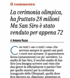 Incasso d’oro a fronte di una vendita a prezzo da saldo, l’impressione è questa. E allora con tutti i «se» e tutti i «ma» che servono sempre in questi casi però i conti non tornano. O quantomeno fanno (amaramente) un po’ sorridere. Lo stadio di San Siro, il vecchio stadio di San Siro (ora bisogna scrivere così visto che due giorni fa ufficialmente è partito l’iter per quello nuovo) per la cerimonia inaugurale delle Olimpiadi, quella dove fece davvero un «figurone» ammirato in tutto il mondo, in una sola sera ha incassato ben 28 milioni che, se rapportati ai 72, il prezzo a cui il Comune lo ha venduto a Milan e Inter, fa capire quanto i due club abbiano fatto un buon affare. A farlo notare è a tirare le somme è stato ieri nell’audizione in commissione comunale della governance della Fondazione Milano Cortina Riccardo Truppo, capogruppo di Fdi a Palazzo Marino. A questo punto la domanda sorge spontanea: è normale aver venduto lo stadio a quella cifra? Certo qualche considerazione va fatta: la cerimonia inaugurale è un unicum costato diversi milioni, allestito negli anni, che ha portato due miliardi di persone a seguire l’evento. Insomma non un partita dell’Inter o del Milan, neppure un derby… Ma tant’è. A Truppo i conti non tornano e ha chiesto al sindaco se può rispondere a queste semplici domande o se è ancora impegnato nei festeggiamenti per la vittoria del referendum. Che con lo stadio c’entra poco, anzi nulla. Però il dubbio che sulla vendita del Meazza questa sinistra sempre così partecipativa, sempre così pronta a confrontarsi con i cittadini e a rispettarne (giustamente) pensieri e decisioni qualche domandina in più poteva farsela…