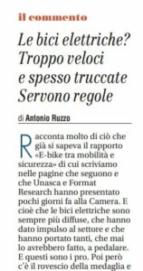 Racconta molto di ciò che già si sapeva il rapporto «E-bike tra mobilità e sicurezza» di cui scriviamo nelle pagine che seguono e che Unasca e Format Research hanno presentato pochi giorni fa alla Camera. E cioè che le bici elettriche sono sempre più diffuse, che hanno dato impulso al settore e che hanno portato tanti, che mai lo avrebbero fatto, a pedalare. E questi sono i pro. Poi però c’è il rovescio della medaglia e cioè che è pratica diffusa modificarle per incrementarne la potenza e quindi esiste un serio problema di sicurezza visto che le e-bike per il Codice della strada restano bici a tutti gli effetti. Negli ultimi tempi poi si stanno diffondendo sempre più le cosiddette «fat bike», cioè quelle bici elettriche con le ruote grosse nate per muoversi sulla neve o sulla sabbia che vengono utilizzate soprattutto dai «riders» e sono nella sostanza motorini ma, non avendo targa, ovviamente non sono soggette a controlli e limitazioni. Chi pedala su questi mezzi va ovunque, anche dove non si può: sui marciapiedi, contromano, nelle corsie riservate. Una anarchia totale e pericolosa. Sarebbe quindi un passo avanti se chi ne ha il potere cominciasse con l’imporre queste bici «commerciali» una targa, un’etichetta, insomma qualcosa che le rendesse riconoscibili e rintracciabili in caso di infrazioni. E ancora cominciasse a rendere responsabile in solido dei comportamenti sulla strada i datori di lavoro di chi le usa per mestiere. E infine cominciasse a normare seriamente un settore dove chi lavora è spesso costretto a rischiare la pelle per una manciata di lenticchie.