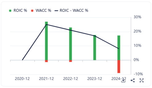 Per prima cosa notiamo che ROIC – WACC è stabilmente al di sopra del 10% e quindi al di là dei dati tecnici di bilancio che sono lunghi e noiosi l’azienda guadagna soldi a doppia cifra: lo storico fino al 31/12/2024 è il seguente: