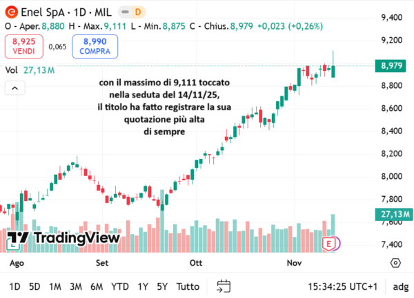 Guardando sviluppi recenti, Enel ha chiuso la settimana con un massimo di 9,111 toccato ieri (venerdì 14 novembre 2025) ed una chiusura ad 8,979. Il massimo di 9,111 rappresenta la quotazione più alta di sempre del titolo.