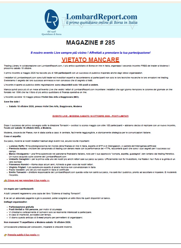 l nostro evento Live sempre più vicino ! Affrettati a prenotare la tua partecipazione! VIETATO MANCARE Trading Library in collaborazione con LombardReport.com, il più antico quotidiano di Borsa on line in Italia, organizza il secondo incontro FREE dei trader a Modena il prossimo sabato 18 ottobre. Il primo incontro a maggio 2025 ha raccolto più di 120 partecipanti con un successo di pubblico insperato anche dagli stessi organizzatori. I redattori di Lombardreport.com sono tutti trader ed investitori esperti e racconteranno ai partecipanti non solo le loro tecniche ma anche le loro emozioni nel trading. Sveleranno il segreto del loro successo […]