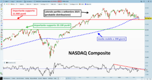 Per quel che riguarda lo S&P500 il grafico è del tutto simile per cui la sua analisi è identica. In questo caso la eventuale rottura del supporto a 6.530 punti (minimo del 21/11/2025) porta sul supporto dei vecchi massimi di fine 2024 – inizio 2025, ovverosia area 6.140 – 6.100 punti.