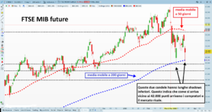 - Al ribasso troviamo una forte area di supporto intorno ai 42.000 – 42.250 punti dove transita anche la media mobile a 200 giorni. Un eventuale passaggio sotto tale area porta a 41.330 punti prima e 40.500 punti poi.