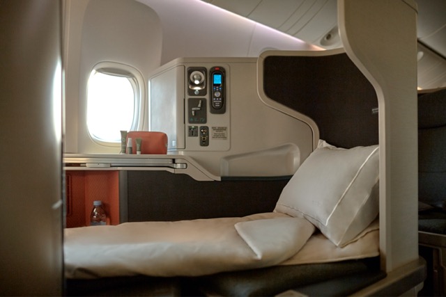 Ampi sedili reclinabili fino a 180° permettono comodamente di mangiare al tavolo, leggere, lavorare, divertirsi con lo schermo ad alta definizione senza rumore grazie alle cuffie Bose e di dormire come in un letto.